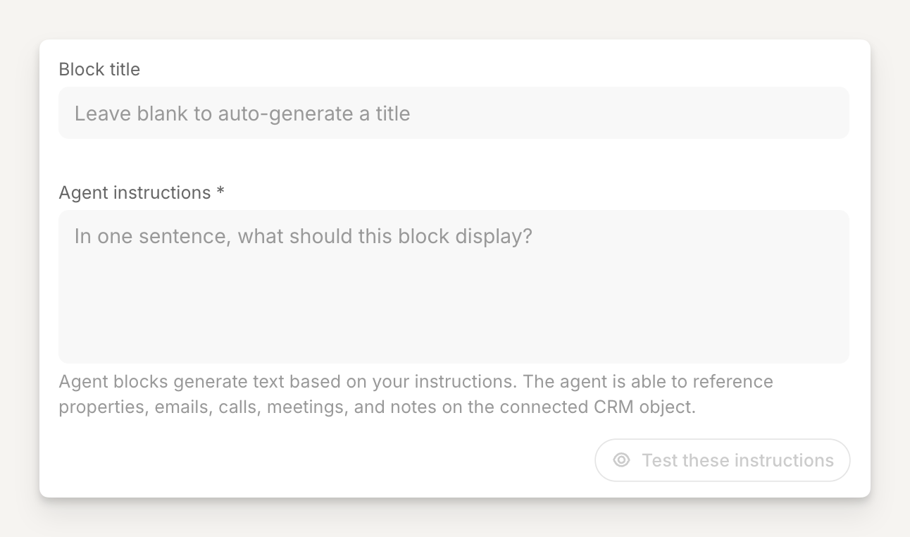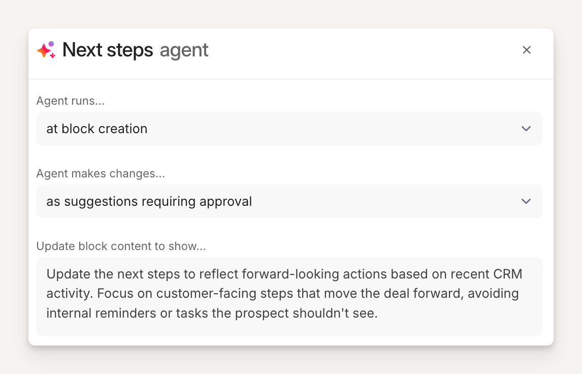 In this example, we want the agent to run whenever new CRM activity is added and automatically make the changes to the block so it is always in the most current state!