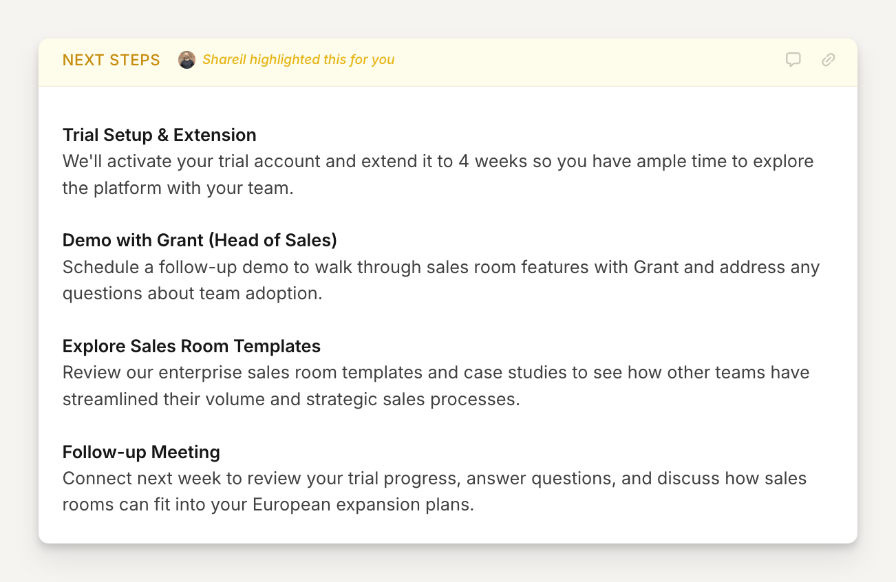 Show buyers that you actually listened. The Next steps block creates a personalized summary of what comes next the moment your call is over.
