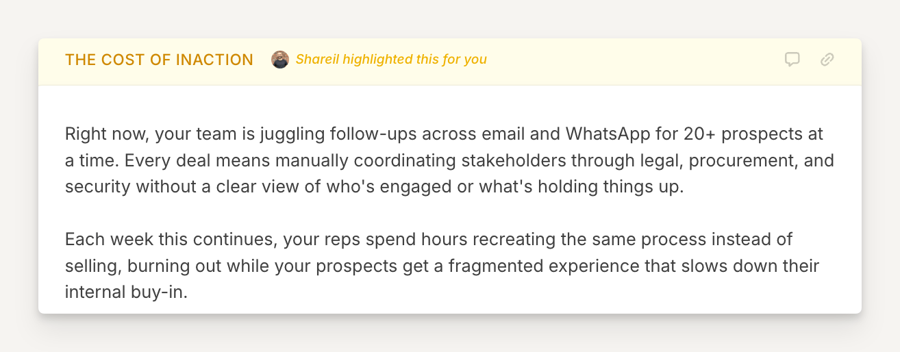 Based on the prospect's stated pain points, write a short buyer-facing summary that captures what staying on their current path actually costs them: in time, deal velocity, rep experience, or revenue. Don't frame this as a product pitch. Frame it as a honest reflection of what their team continues to absorb every week this problem goes unsolved. Write in second person, 2-3 sentences, and 2-3 paragraphs. Be specific to what they've shared - avoid generic pain language and em dashes.