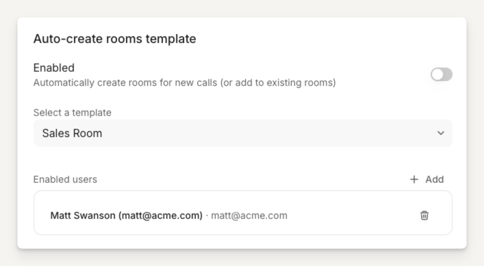 Select which Arrows users the Gong integration is enabled for: the integration will only create room for Gong calls where the host email matches the Arrows user email in this list