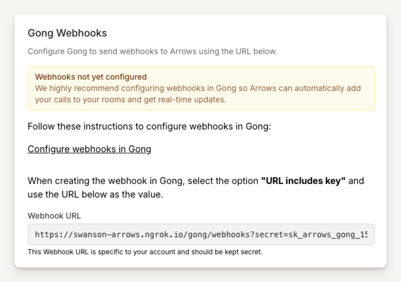 Return to Arrows > Settings > Gong and verify that the Gong webhooks shows a green “Webhooks configured” success message