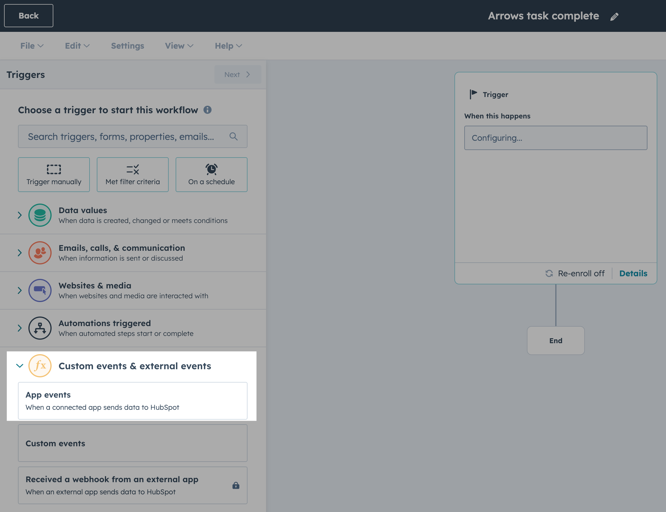 Select an enrollment trigger based on custom events & external events