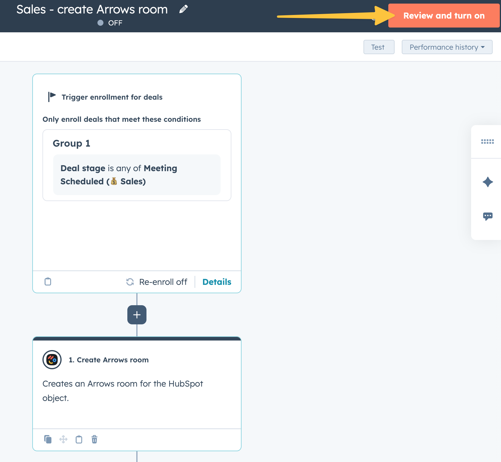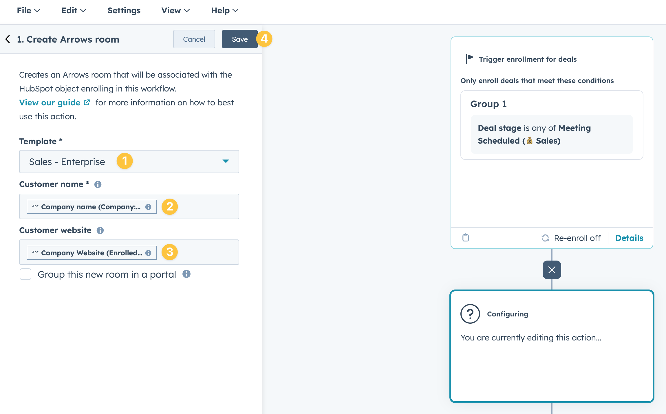 Using a HubSpot workflow action, you can automatically create and attach Arrows sales rooms to your HubSpot deals.
