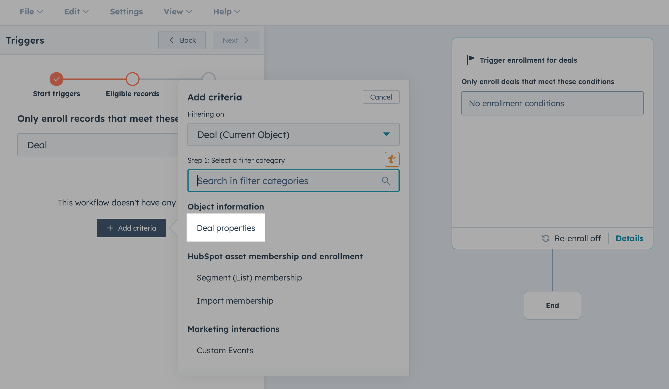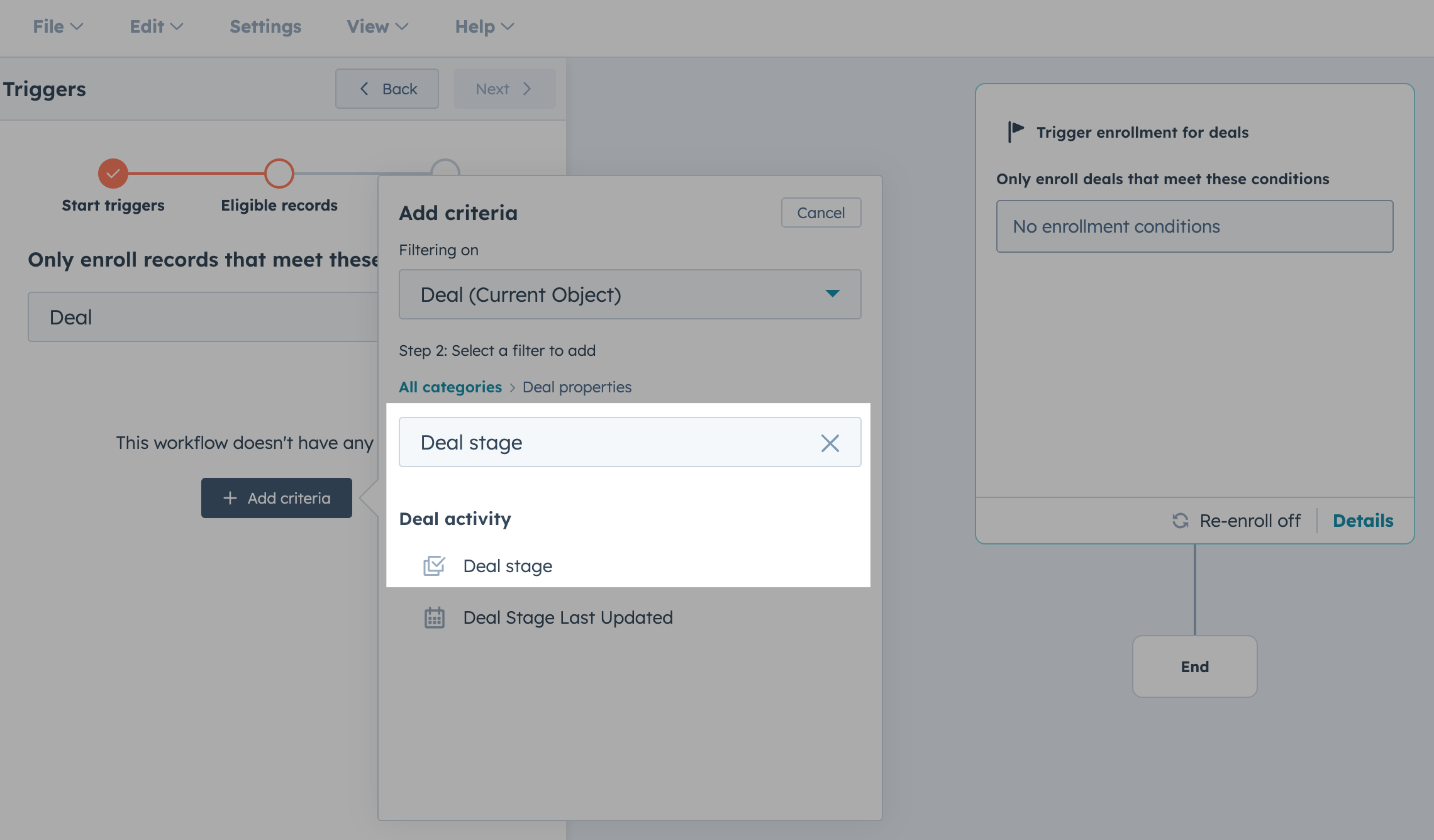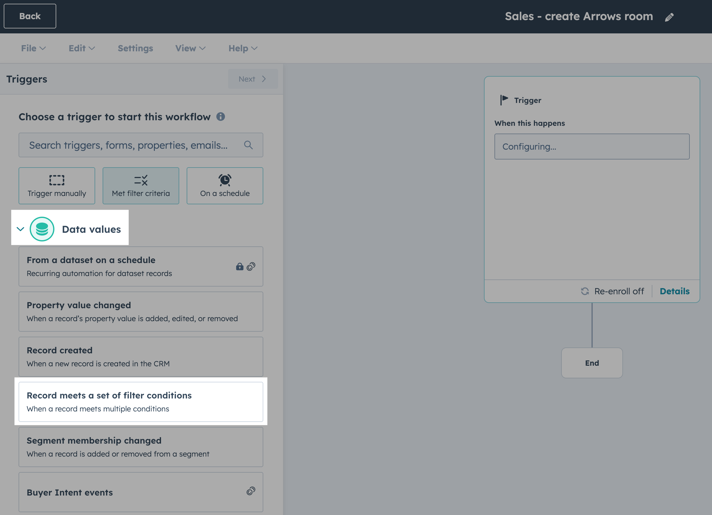 In this example, we are using a Data values trigger for when a Record meets a set of filter conditions - and we will pick specific deal stages for our enrollment to start.