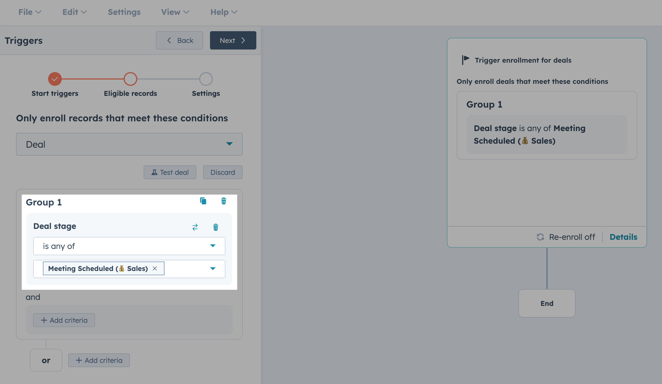 For the criteria, we are choosing the deal stage Meeting Scheduled in our sales pipeline.