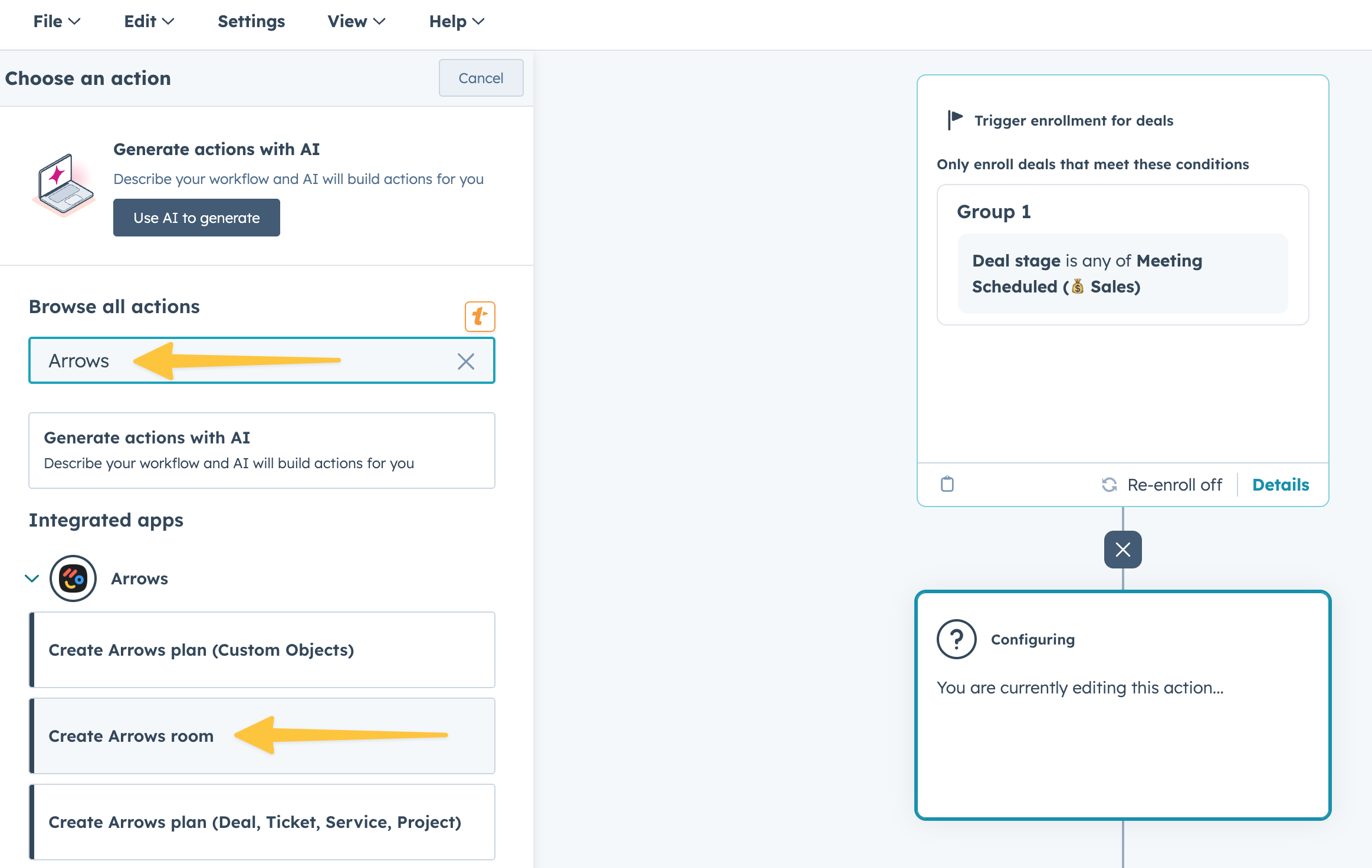 Select the Create Arrows room workflow action