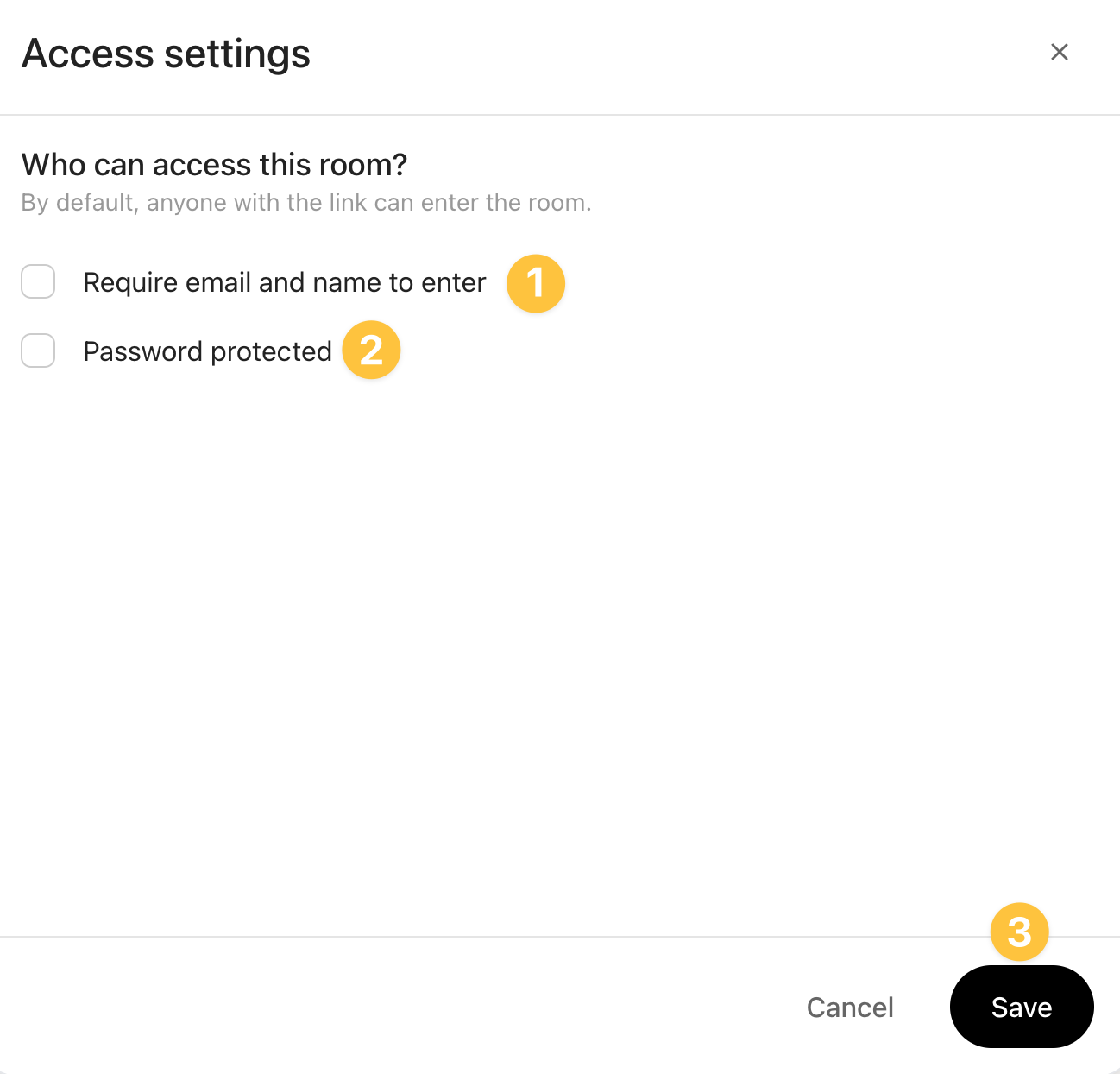 A guide explaining the access settings you can control for how your rooms are allowed to be viewed. Rooms can have open access or password protection.