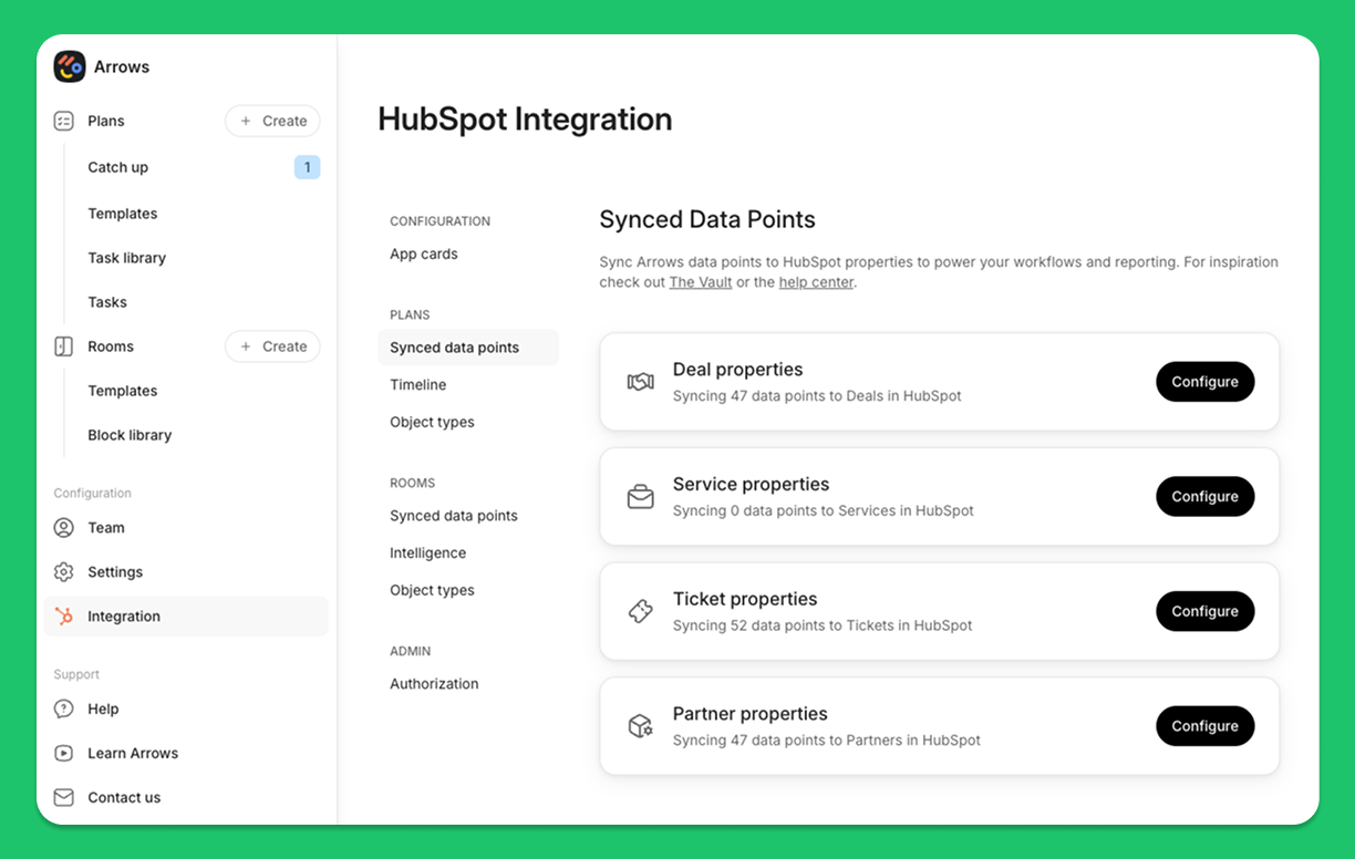For that object, select the properties you want to sync into Arrows under Synced data points → Configure