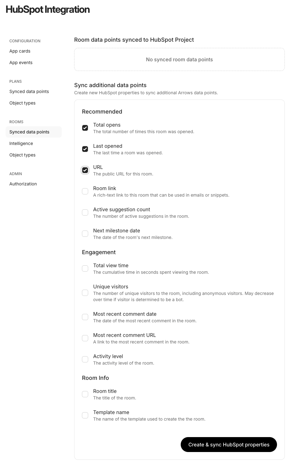 Select the data points to sync and press Create & sync HubSpot properties.