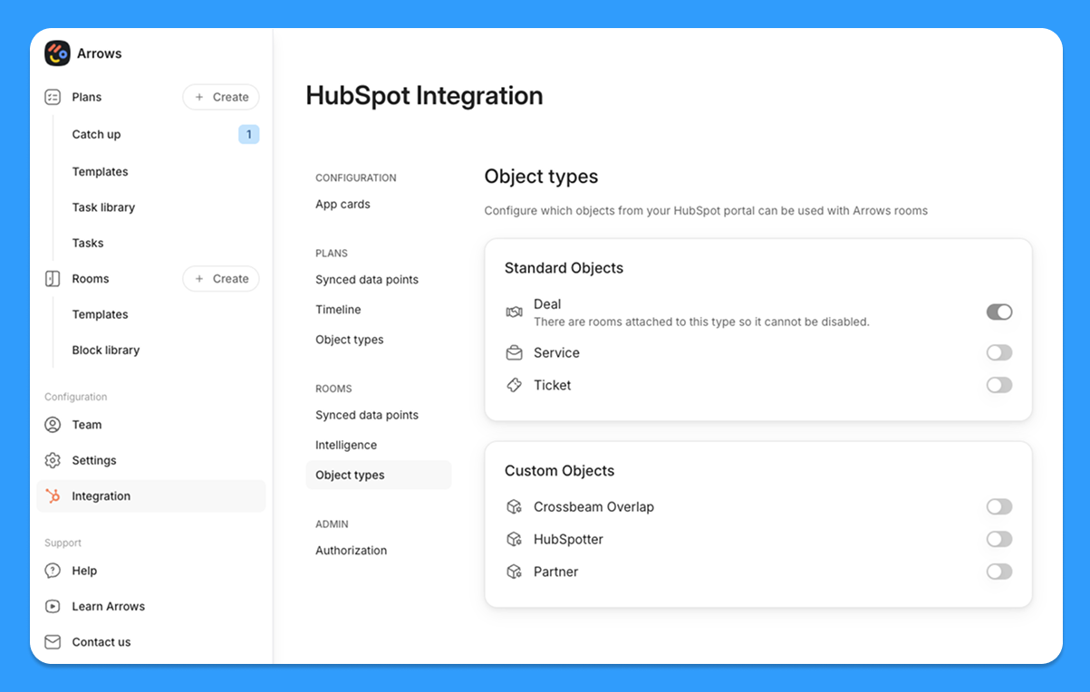 Arrows sales rooms connect to deals, tickets, services, projects, and any custom objects in HubSpot.