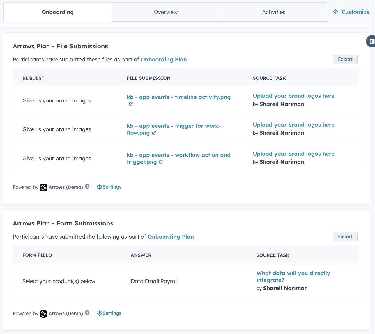 Using Arrows task actions for file requests and form fields, you can easily collect customer information in Arrows and then access all that data inside HubSpot, right where it should be with all the rest of your customer data.