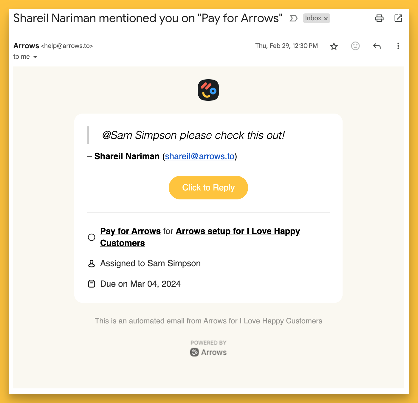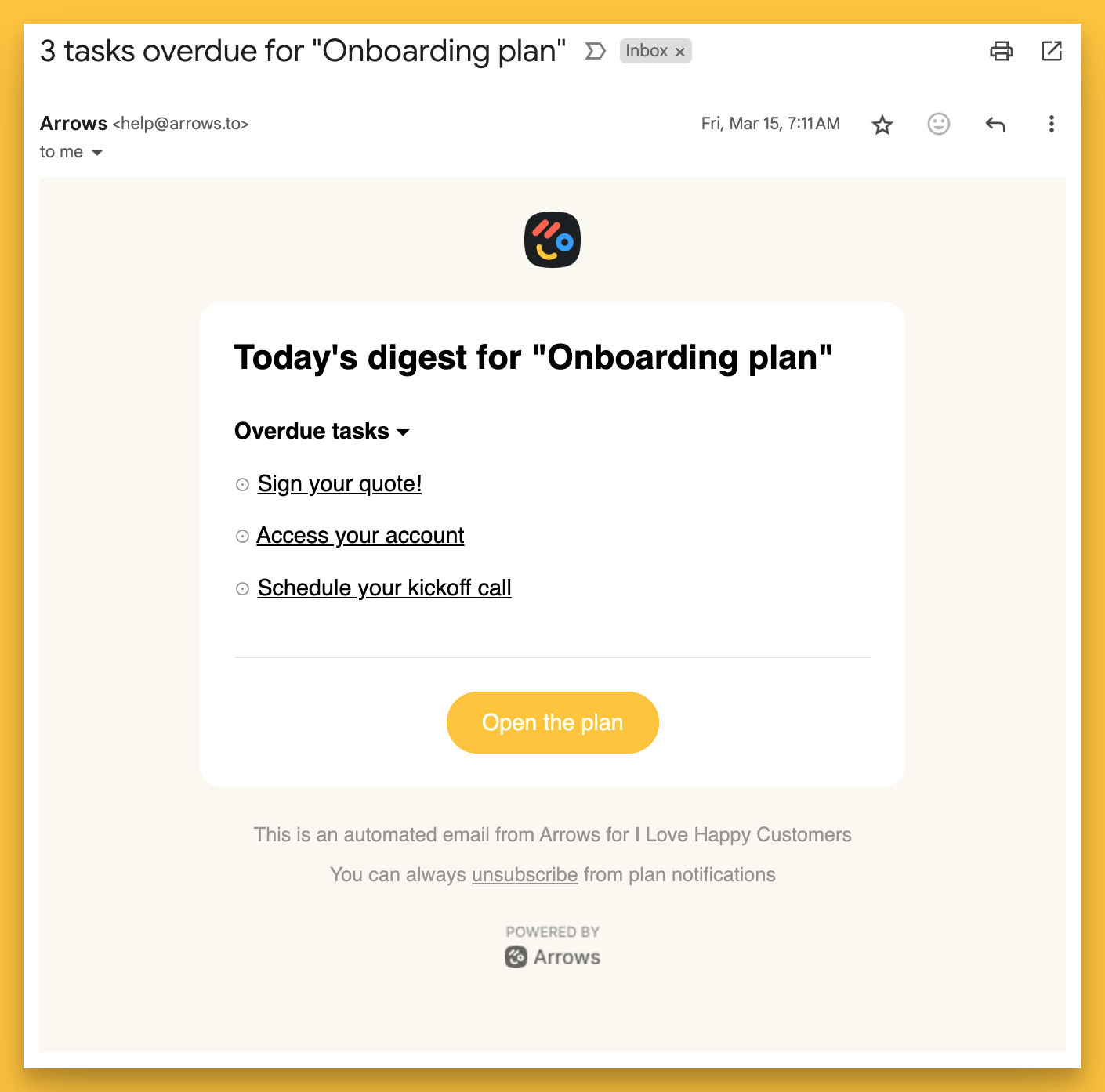 Note: Arrows will only send ONE reminder email a day for overdue tasks. These emails simply state which tasks are overdue and provide links directly to them!