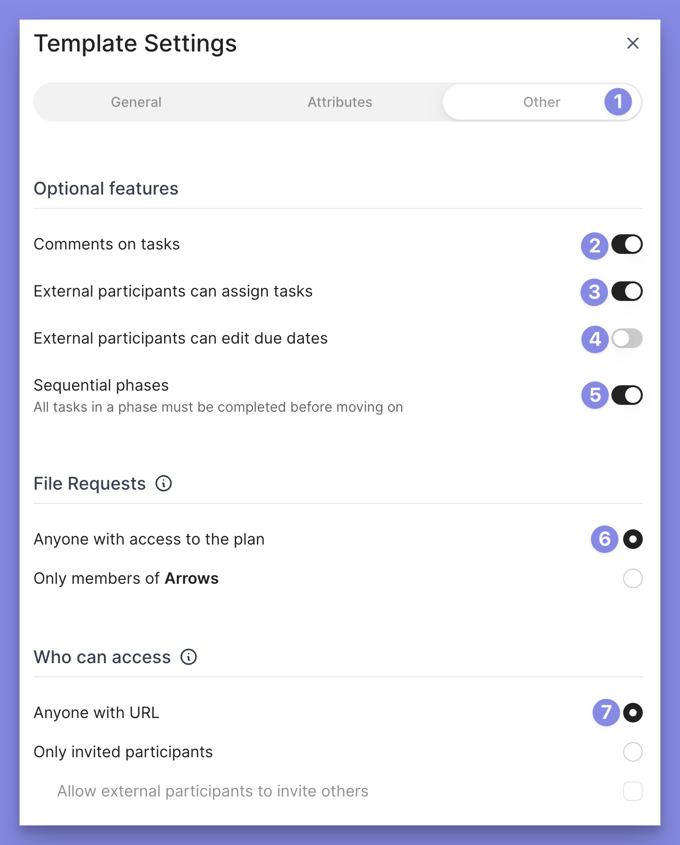 access to files uploaded to arrows - by default, participants who have access to your plan can download files that are uploaded to the plans. To only allow your team members to download files, switch this to “Only members of [your company]”