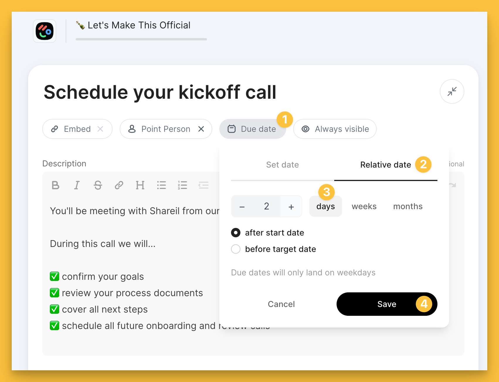 In the example below, we set a relative due date of 2 days after start date for the “Schedule your kickoff call” task.