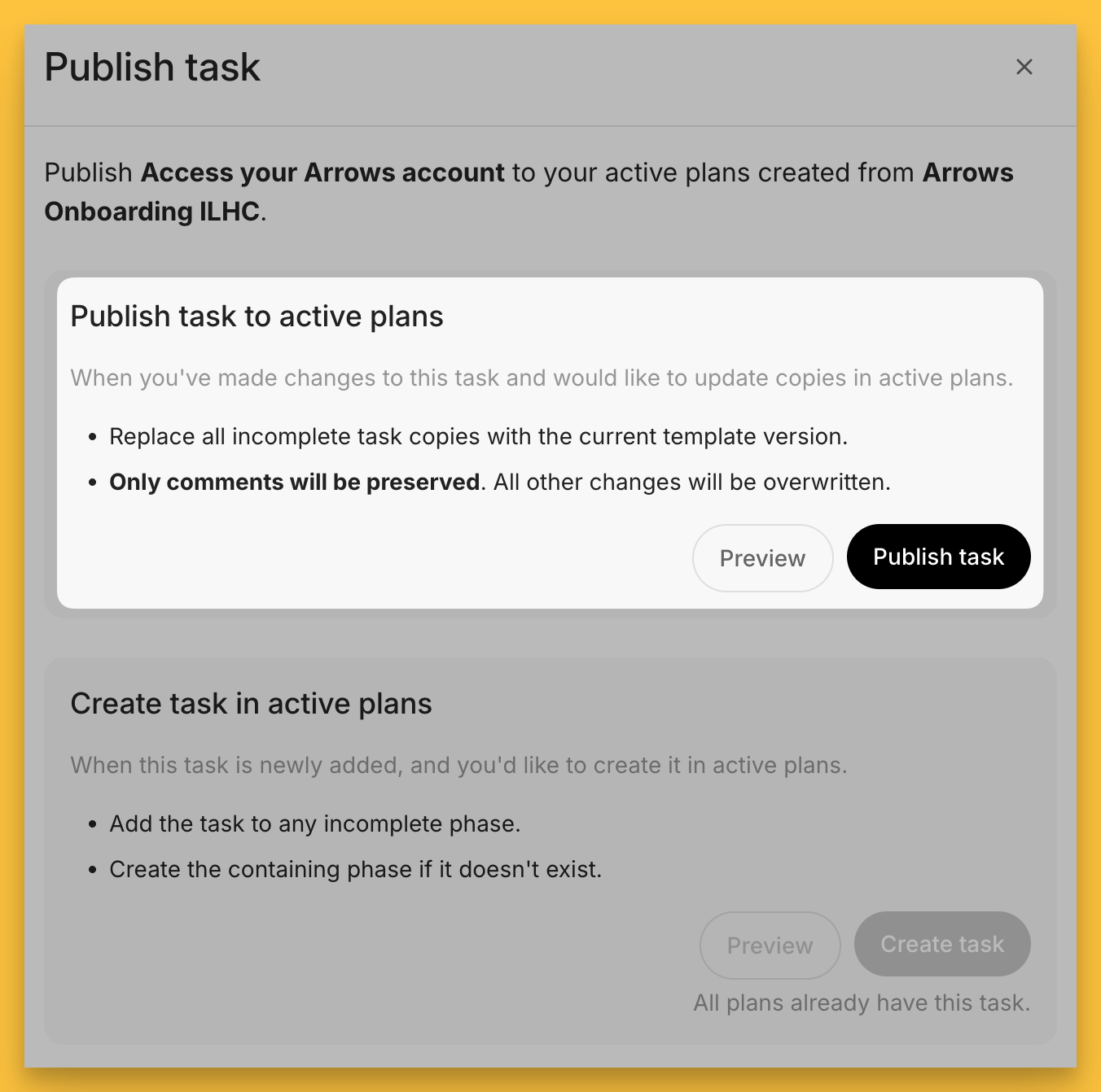 If you make changes to existing tasks, the Publish task… drawer will give you the option to push those changes to existing plans.