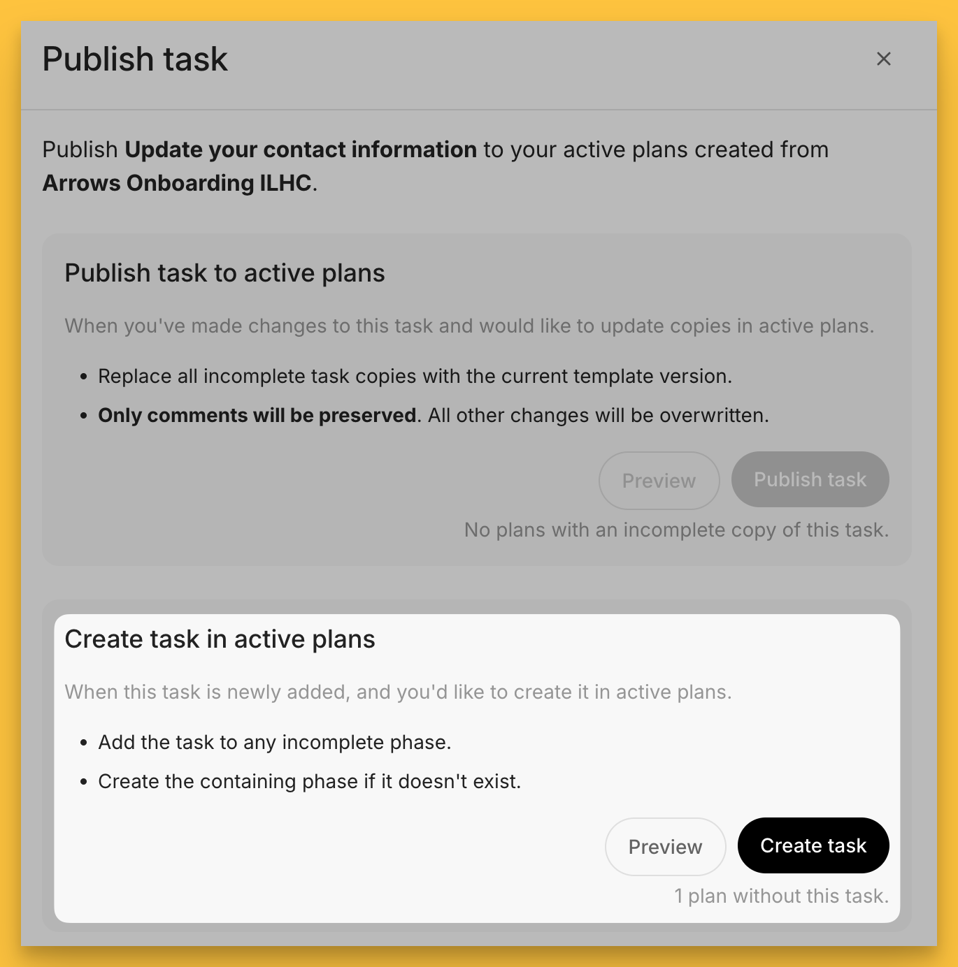 If you add a brand new task, the Publish task… panel will give you the option to Create task for existing plans. A popup notification will ask you to confirm the change and soon those existing plans will reflect the changes