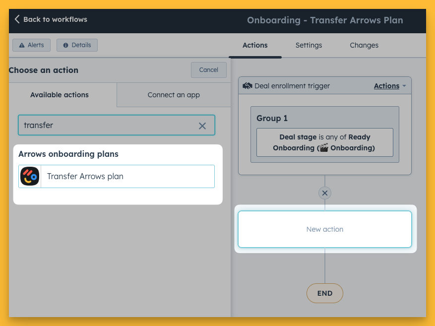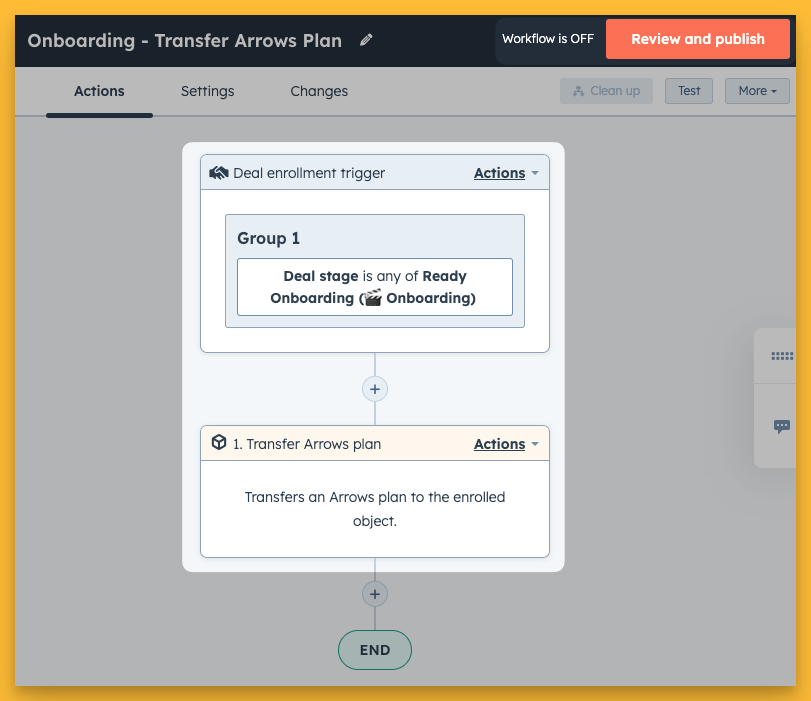 This is a setup guide for using the Transfer Arrows Plan workflow action in HubSpot to transfer an Arrows plan from one record to another (ex. sales deal to onboarding deal)