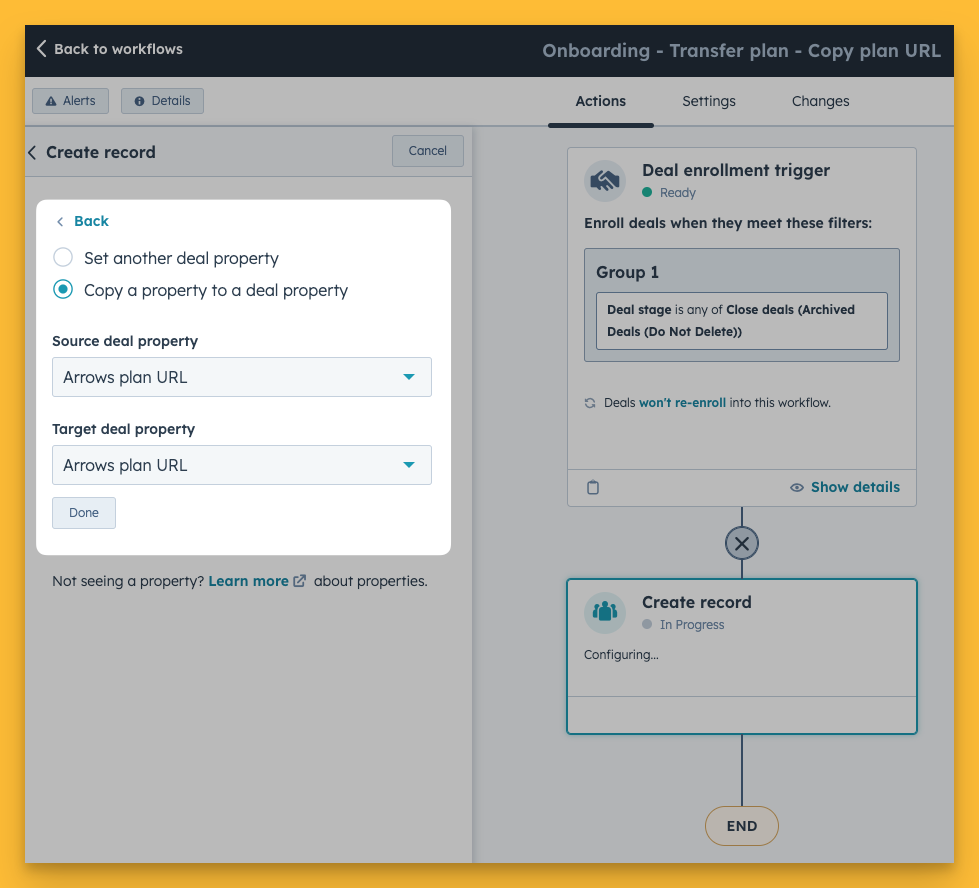 Choose the option to Copy a property to a deal property and choose the Arrows plan URL as the Source and Target property.