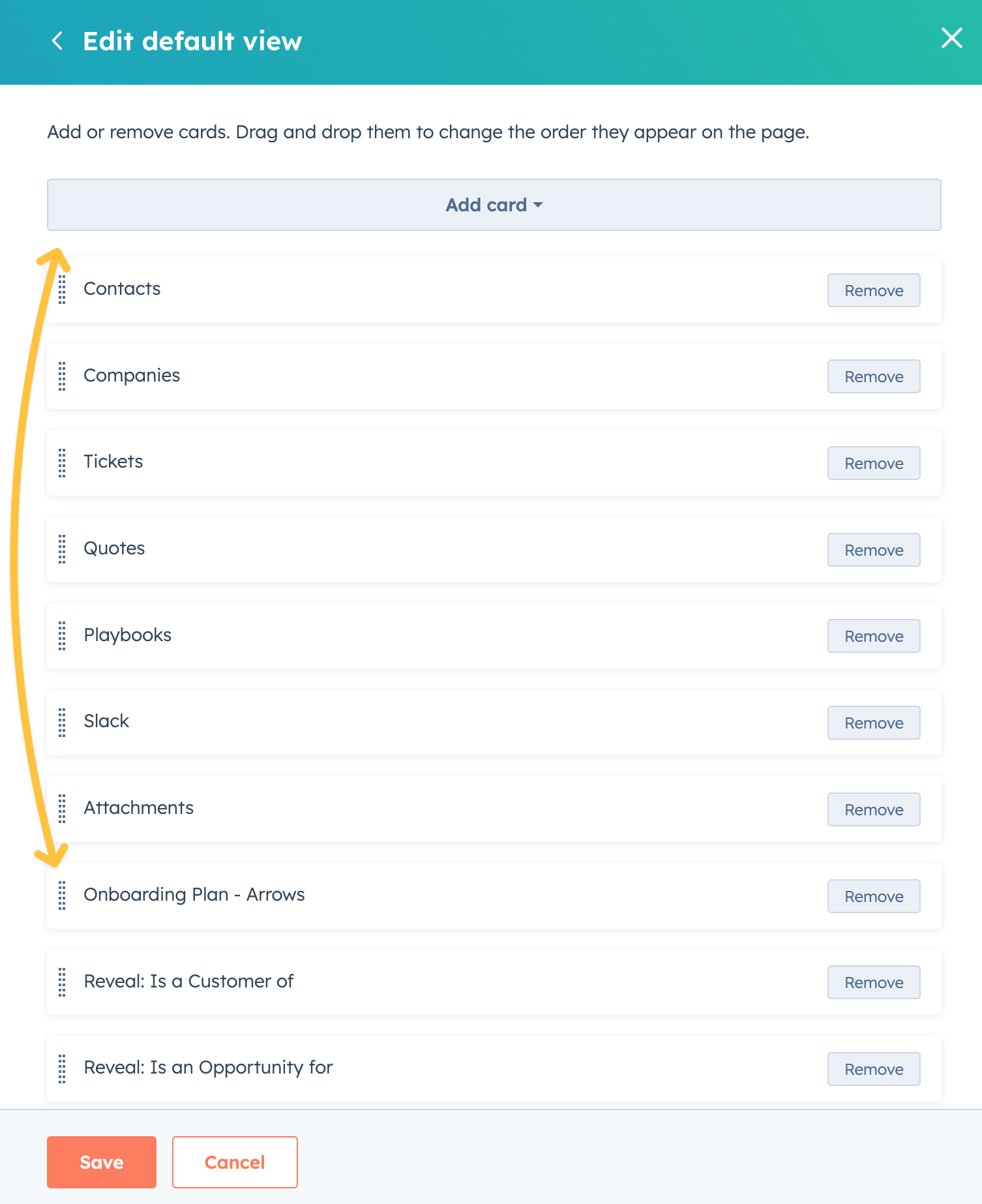 You can customize where this Arrows CRM card is on the right-side column so that it is easier to reference the next time you open that onboarding Deal or Ticket.