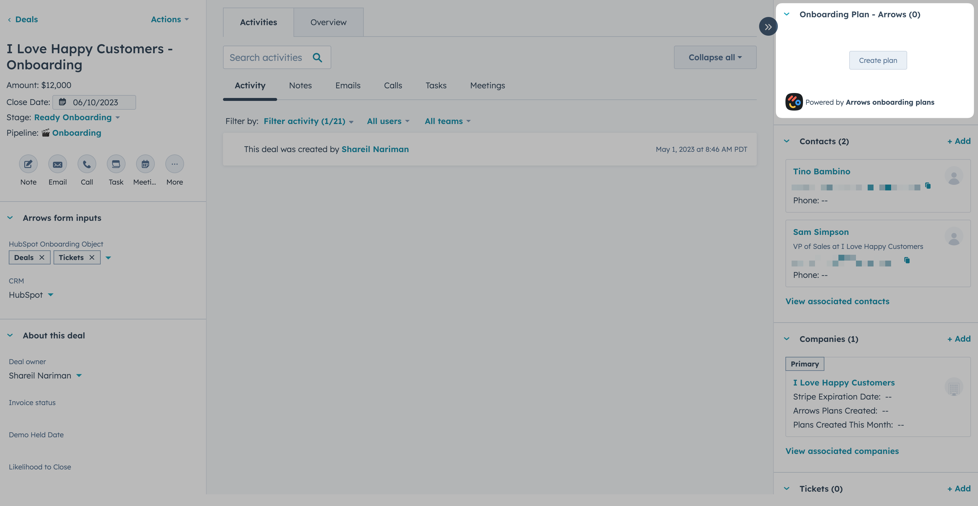 Select Create plan and follow the according steps to create a plan - learn more here Once a plan has been created, the Arrows card is an easy place to monitor that customer’s progress. You can also open the plan, glance at a plan overview, and gauge progress towards your timeline, right from HubSpot.
