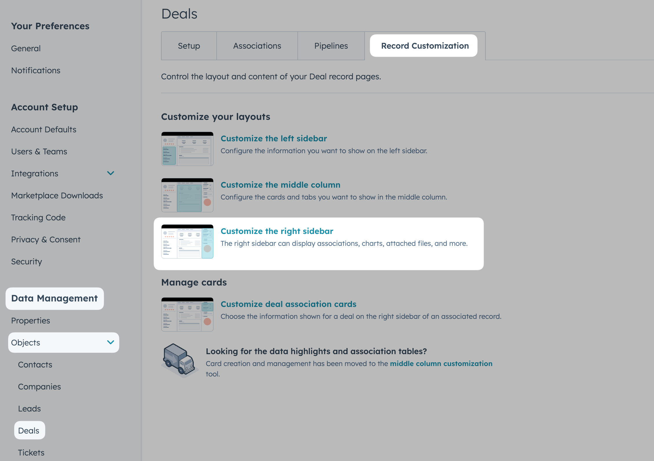 From your HubSpot settings, select the object you’re using (Deals in this example) and from the Record Customization tab, select Customize the right sidebar