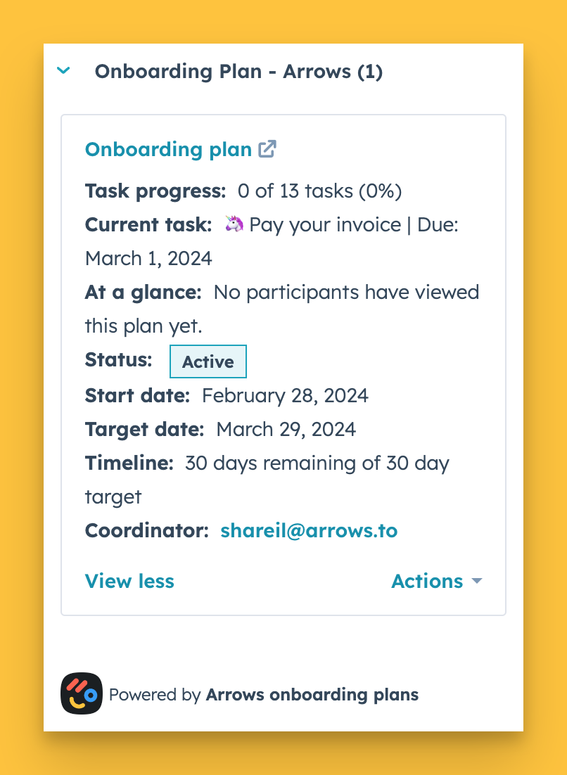 This Arrows CRM card should allow you to get a peek into what's happening in the customers onboarding plan and easily access the plan itself to take action!