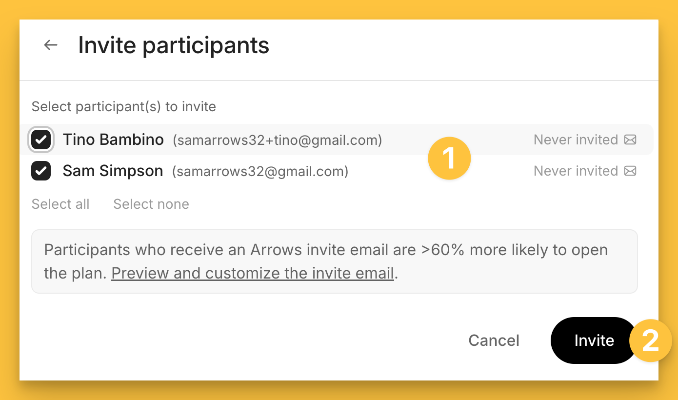 Note: this invite email is based on whatever your Arrows admin setup for that plan template. You can customize it for this specific plan by clicking Preview and customize the invite email.