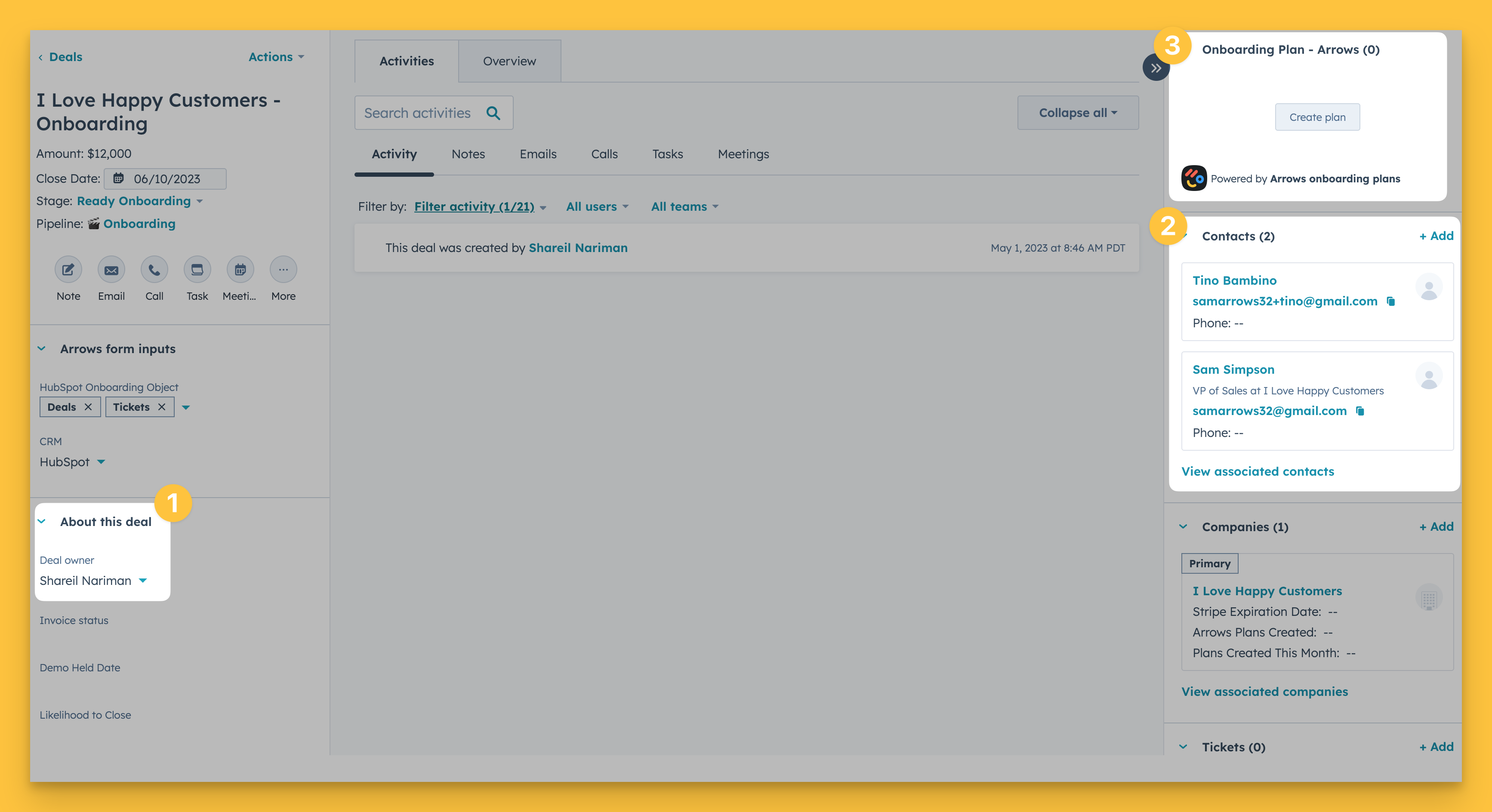When you’re ready to create and send a plan, you can access the Arrows card from the HubSpot Deal and/or Ticket object.