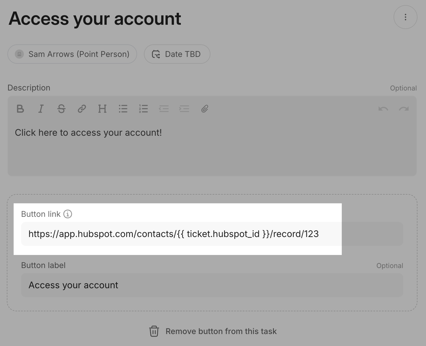When you need links or buttons that direct customers to unique pages (like their specific HubSpot portal, account dashboard, or custom URL), you can use dynamic text tags instead of hardcoding IDs into each task.